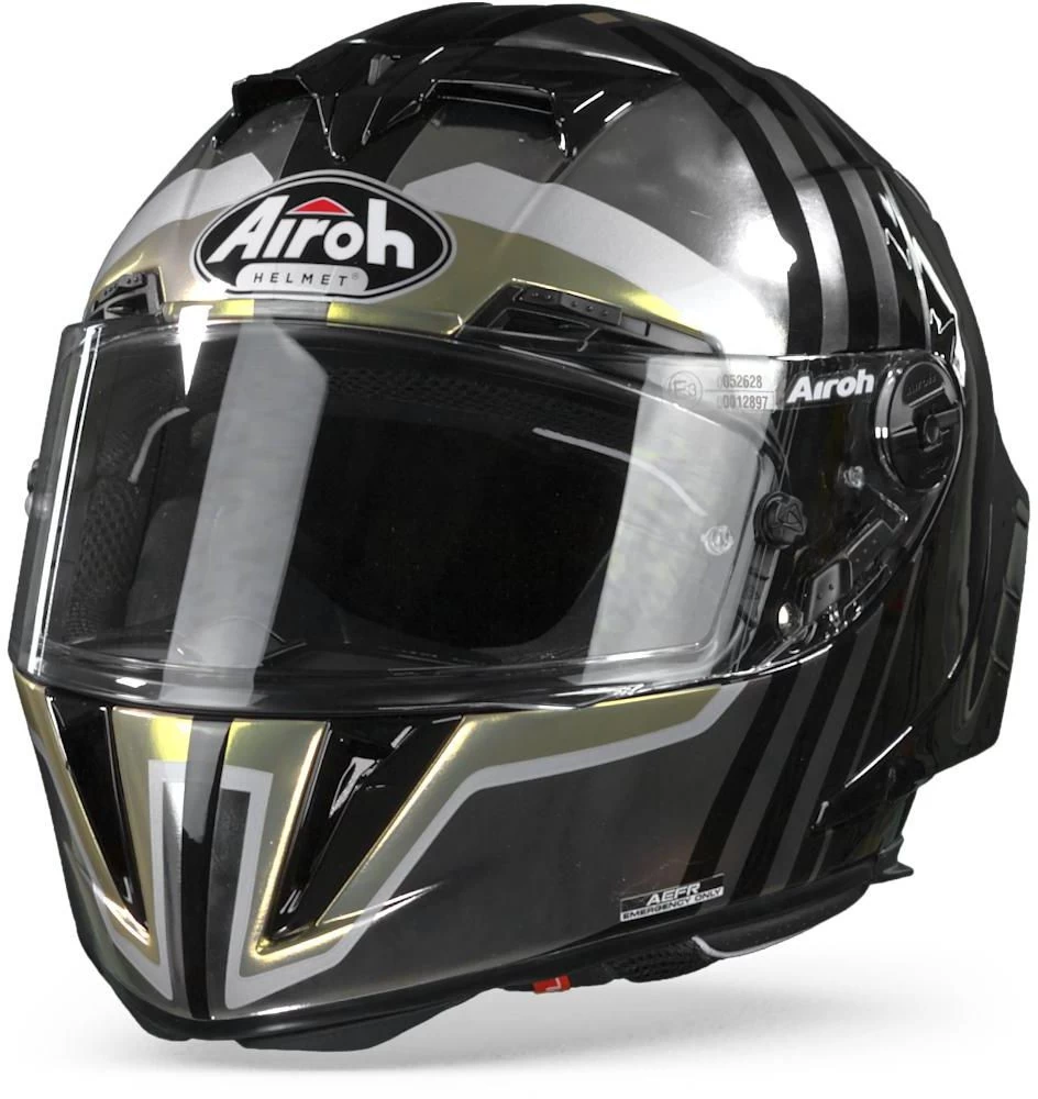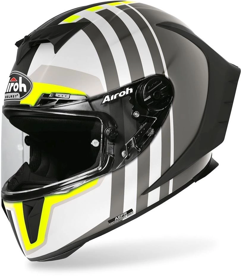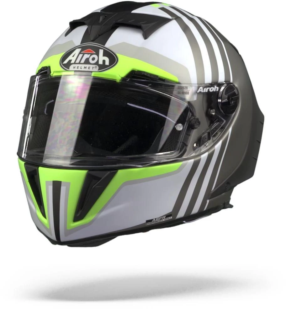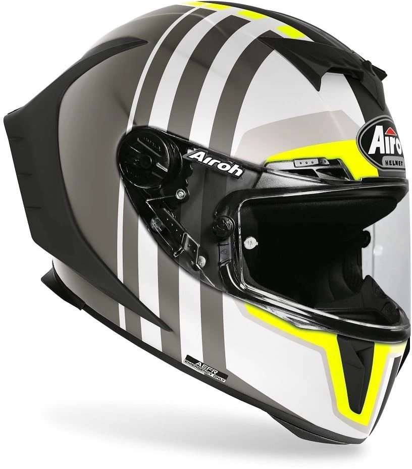3 unterschiedliche Schalengrößen aus HPC (High Performance Composite), zugelassenes 2D-Rennvisier aus Rauchglas und Schnellentriegelung, 8 Lufteinlässe für eine optimale Belüftung, inklusive Pinlock-Visier, Tear-Off Abreißvisier-Ready, Windabweiser und AEFR-System (Airoh Emergency Fast Release) zum schnellen Entfernen der Wangenpolster im Notfall vervollständigen die Ausstattung eines bahnbrechenden Produkts.