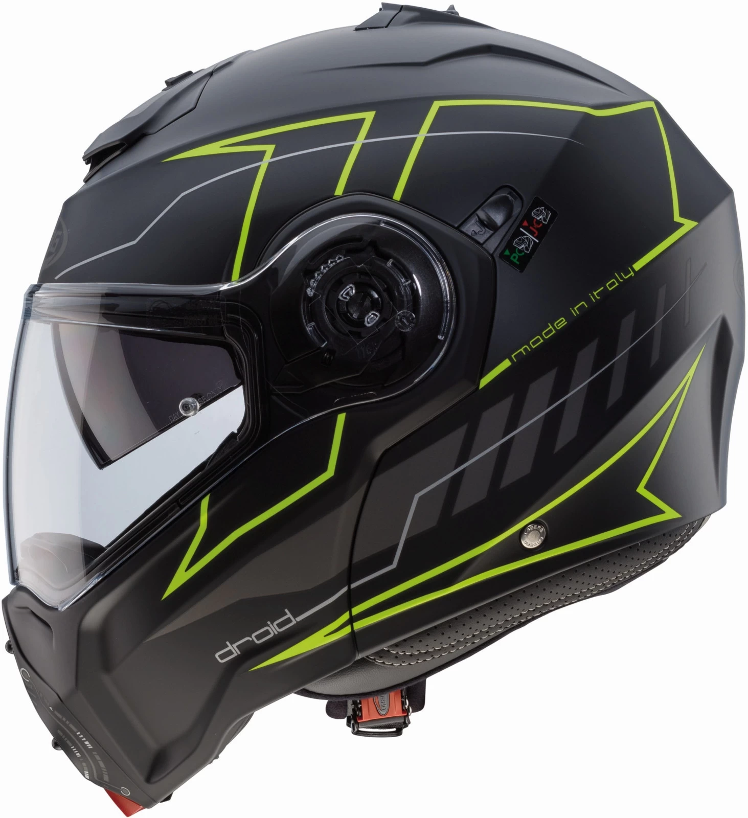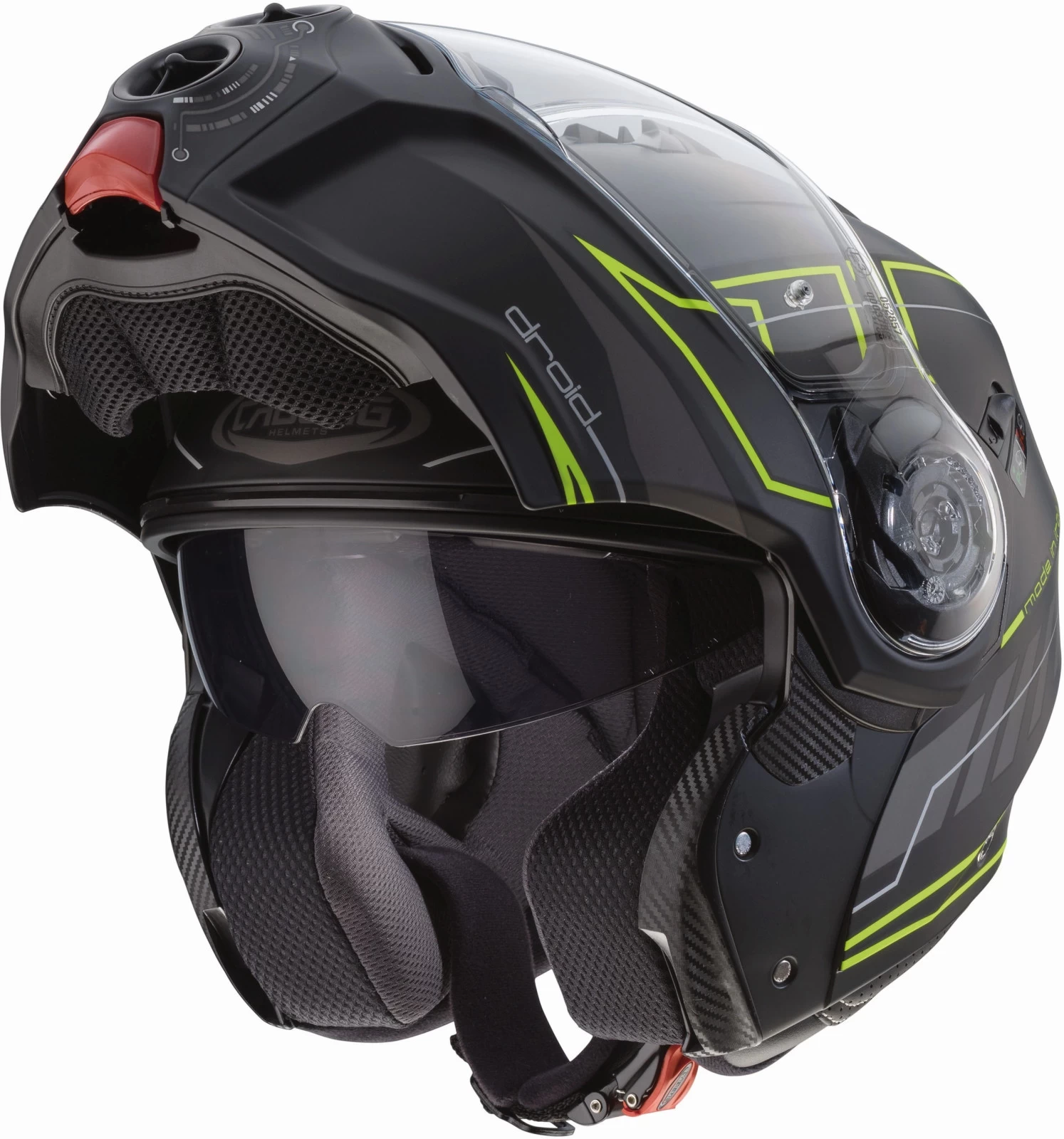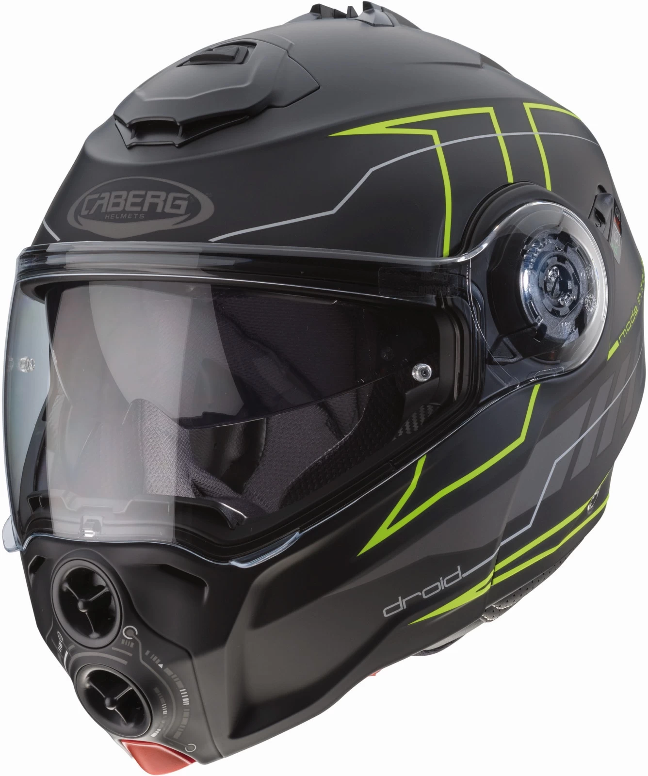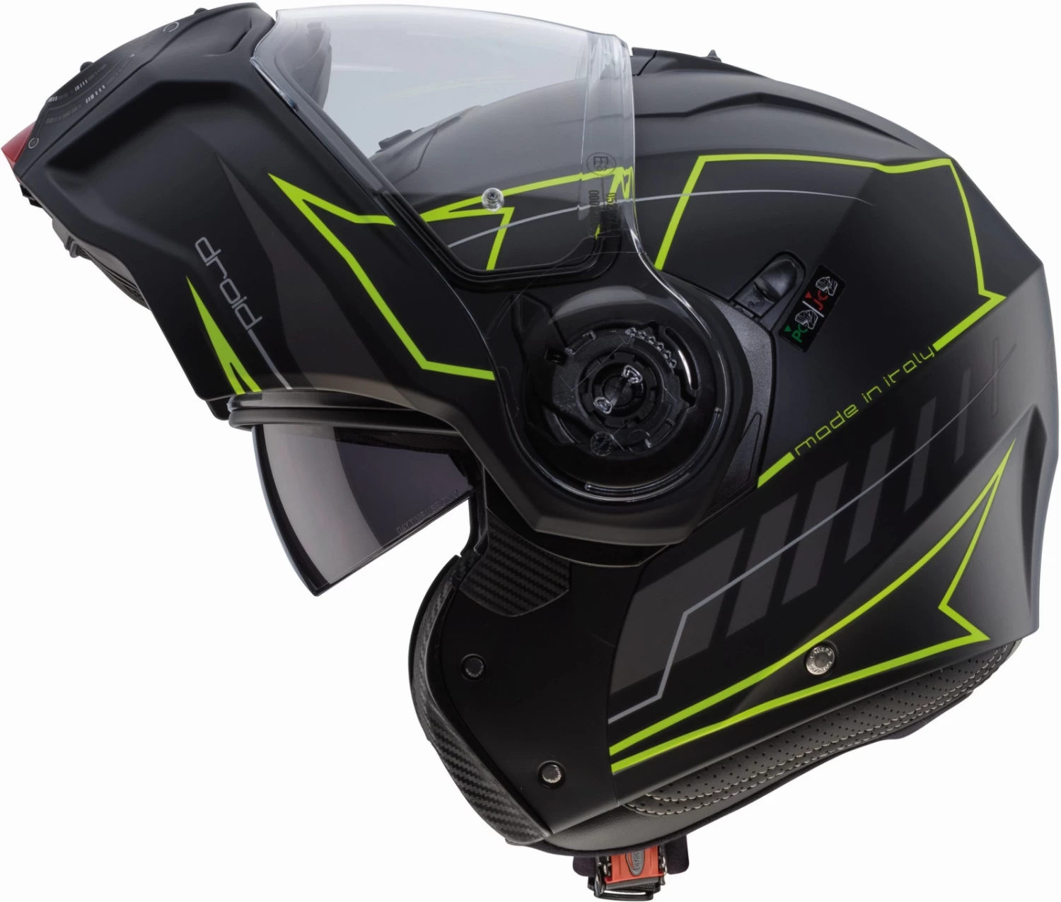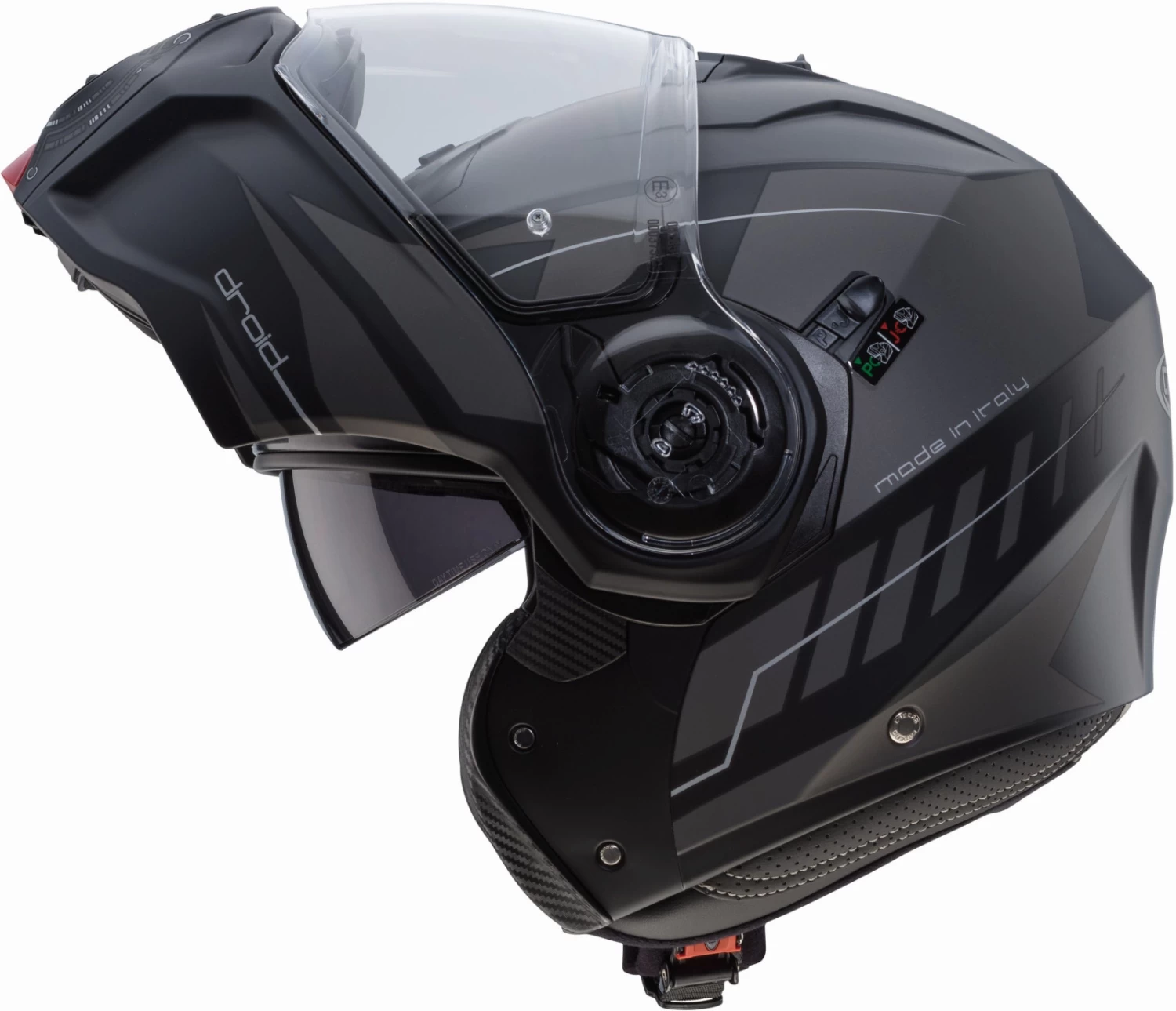 Der Caberg Klapphelm Droid mit innovativen, technischen Lösungen ist mit der Dual Homologation P/J und mit zwei individuell verstellbaren Lüftungsschlitzen ausgestattet: kein beschlagen des Visiers und maximale Sicherheit!