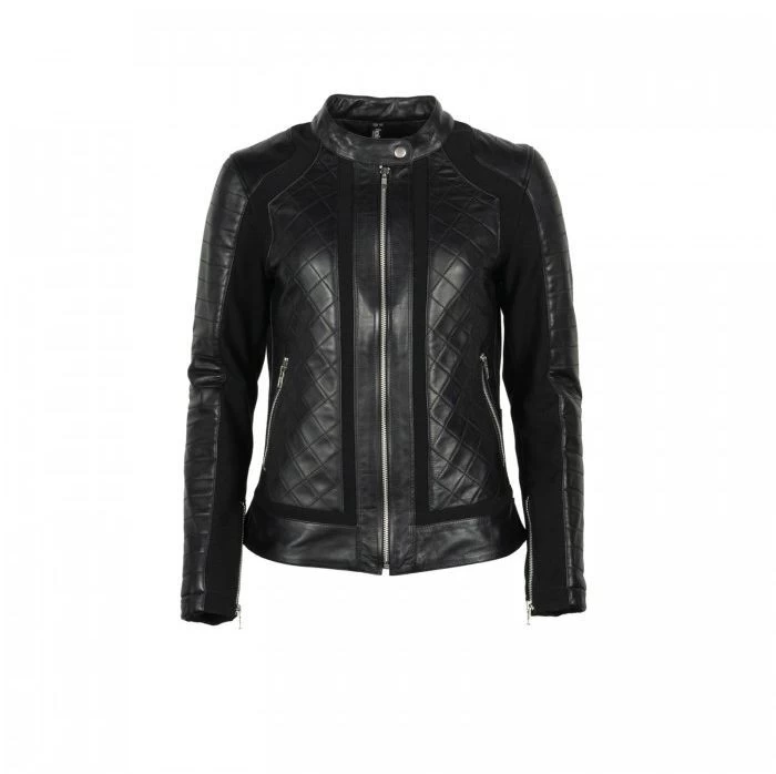 Damenmodell Taillierter Schnitt Ganzjahresjacke aus schwarzem vollnarbigem Rindsleder 0,8 mm bis 1 mm dick mit mehreren Stretcheinsätzen Stretcheinsätze für optimalen Tragekomfort Naturleder, sehr weich, glatt und fettig im Griff Festes Mesh-Futter (Körper und Ärmel) mit 2 Reißverschlusstaschen 2 Außentaschen mit Reißverschluss Verstellbare Laschen für die Ärmelbündchen Sehr widerstandsfähige Aramidfaser-Einlage, die das gesamte Teil bedeckt Reißverschluss-Seitenfalte Abnehmbare CE-konforme Schutzhüllen (Schultern, Ellbogen und Rücken) Regenschutz durch eine wasserdichte und atmungsaktive Membran atmungsaktive Membran CE-geprüfte Jacke