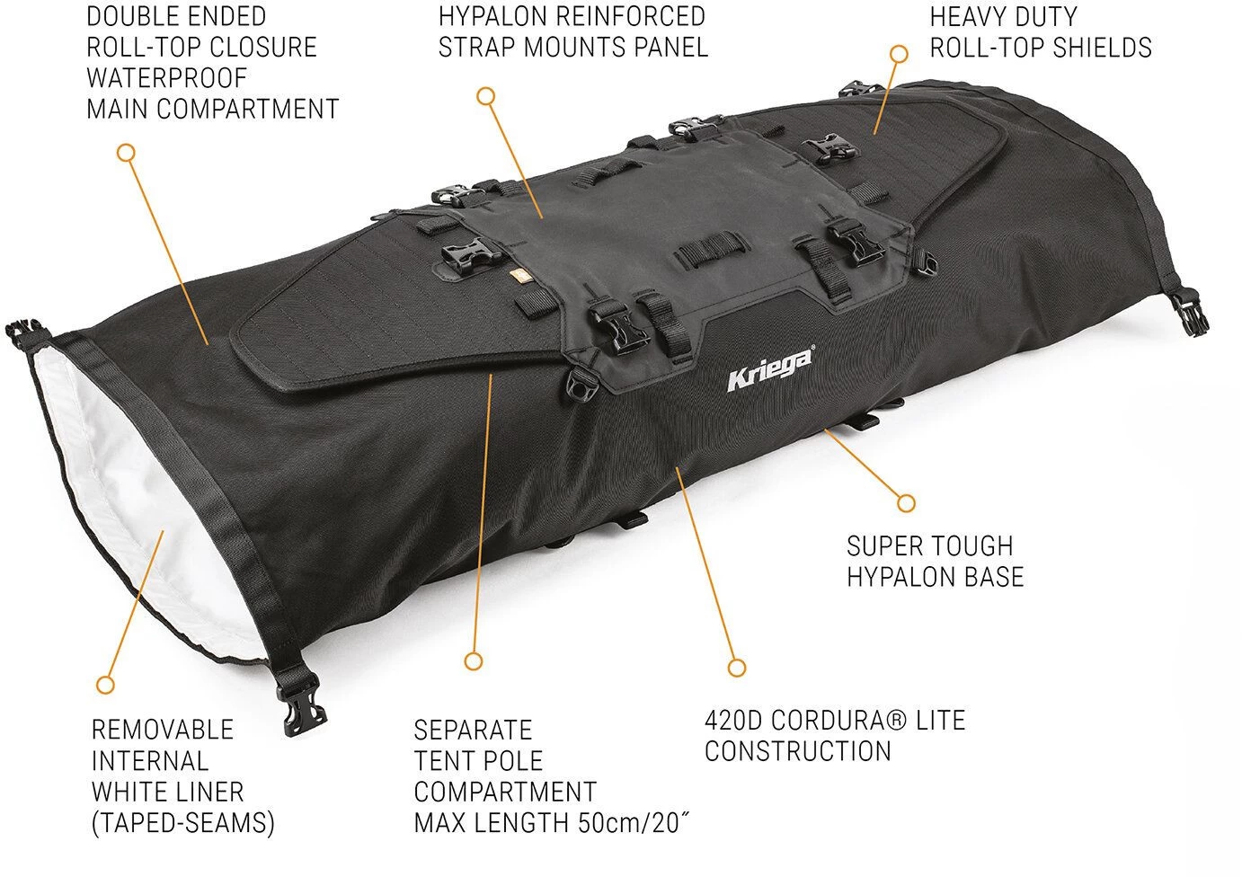 Der 40-Liter-Rucksack ist perfekt für die Aufbewahrung von Zelt, Rollmatte oder Schlafsack und verfügt über einen separaten Zeltstangentunnel, was ihn zu einer großartigen Wahl für Motorradcamping macht. Zudem lassen sich die beiden Enden aufrollen, wodurch sich das Fassungsvermögen auf 28 Liter reduziert, was sich sehr gut für wasserdichte und warme Kleidung für Kurztrips eignet. Der neue lange Hakenriemen und das Hakensystem ermöglichen die direkte Verbindung der Tasche mit dem Gepäckträger oder anderen Strukturelementen des Motorrads. Die verstärkte Gürtelschlaufe und die Hypalon -Schnalle bieten eine sichere Verbindungsmöglichkeit für USDrypacks, OSPacks oder optionales Zubehör sowie einen verstellbaren Schultergurt für freihändiges Tragen.