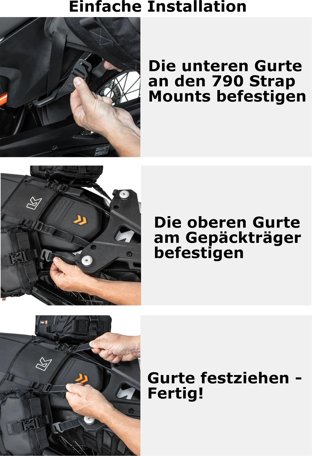 Die OS-BASE ist ein „Over-the-Seat-Gurt“, mit dem OS-6, OS-12 oder OS-18 ADVENTURE PACKS als weiche Packtaschen montiert werden können. Es sind keine zusätzlichen Rahmen erforderlich. Dieses System bietet eine superharte, leichte Tragelösung für die KTM 790 ohne Bohren oder dauerhafte Änderungen der Karosserie am Motorrad.