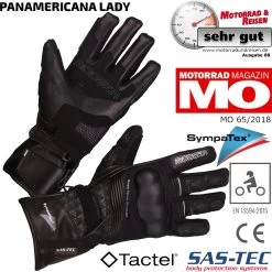 Tourenfahrer (8/2019): „Der wasserdichte Panamericana Lady mit langer Stulpe und weichem Polyester-Futter ist ein gelungener Allwetter-Handschuh mit guter Passform.“