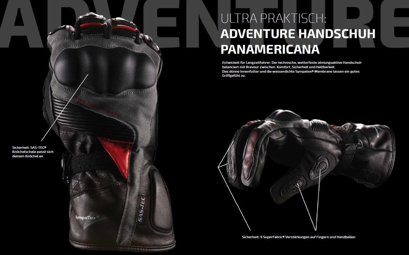 Vielseitiger, wasserdichter Adventure-Handschuh: Der Panamericana Handschuh wurde speziell für Fahrten auf der Straße oder im Gelände bei instabilen Wetterbedingungen im Frühling, Sommer und Herbst entwickelt. Er basiert auf dem Adventure-Anzug Panamericana, bei dem unser Entwicklerteam die Belüftung gegen Wasserdichtigkeit eintauschte. Erwähnenswert ist der 3D-Knöchelprotektor von SAS-TEC®, welcher aus einem flexiblen, viscoelastischen Weichschaum besteht und eine hervorragende Schutzdämpfung aufweist.