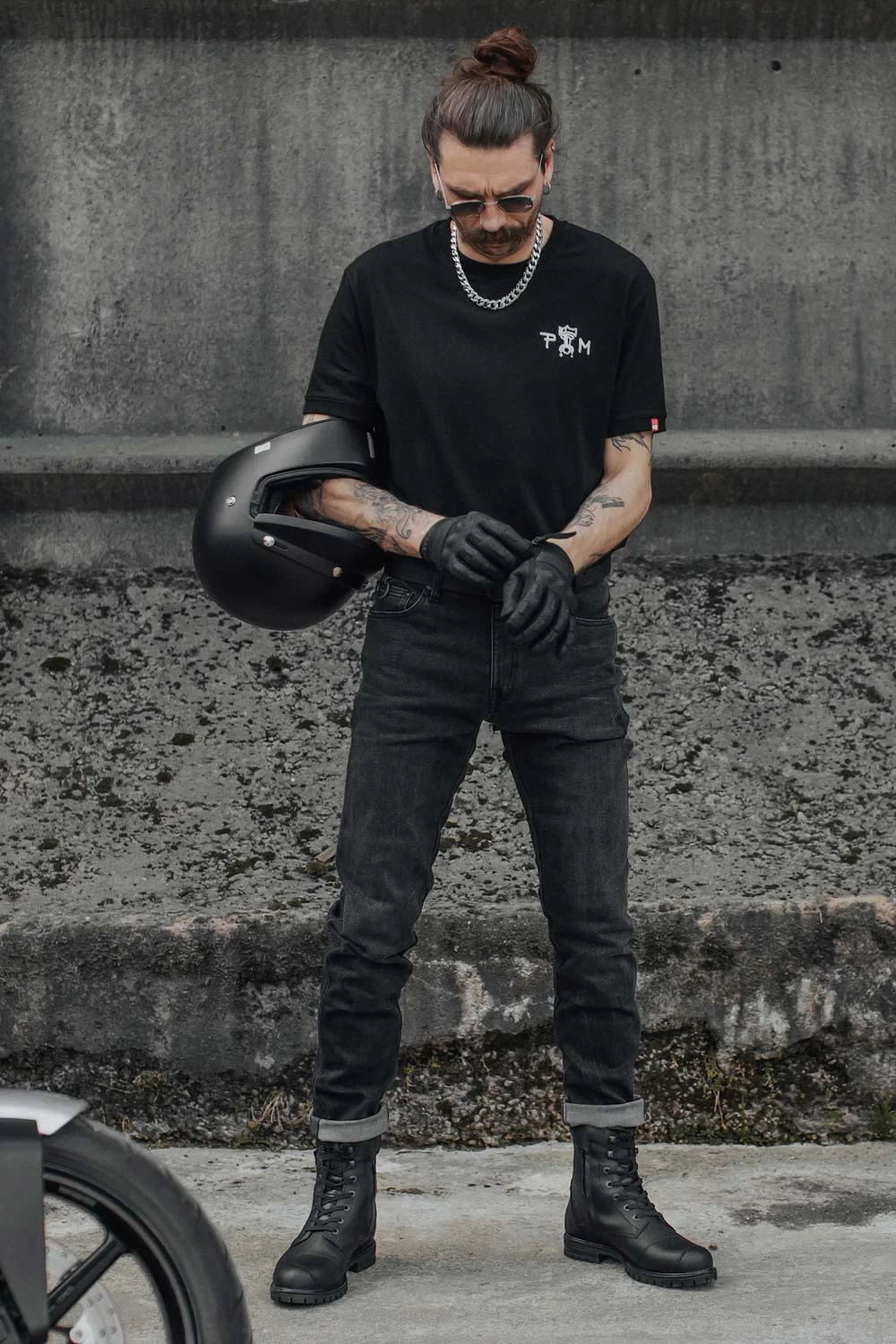 Schlichtes, schnörkelloses Design für maximalen Komfort unterwegs – dafür steht der ROBBY ARM 01 Herrenjeans von Pando Moto. Schmal geschnittene, schwarze Jeans mit Regular Waist und ohne zusätzliche Nähte im Vorderteil.
