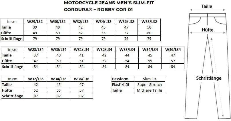 Fahre mit Stil mit der ROBBY COR 01 von Pando Moto – deiner SlimFit Motorradjeans, die speziell entwickelt wurde, um dich überall sicher zu halten. Bei dieser Jeans trifft tadelloses Design auf unübertroffene Vielseitigkeit, perfekt für jede Jahreszeit. Einzigartige Handarbeit im Alter verleiht klassischen schwarzen Jeans einen zeitgemäßen Look und einen Hauch von Originalität.Dank CORDURA® 12oz Superstretch Denim, der mit der COOLMAX® Technologie für unvergleichlichen Tragekomfort kombiniert wird, ist eine gleichbleibend exzellente Passform garantiert. Ausgestattet mit einer SAS-TEC TripleFlex Knieorthese für zusätzliche Sicherheit.
