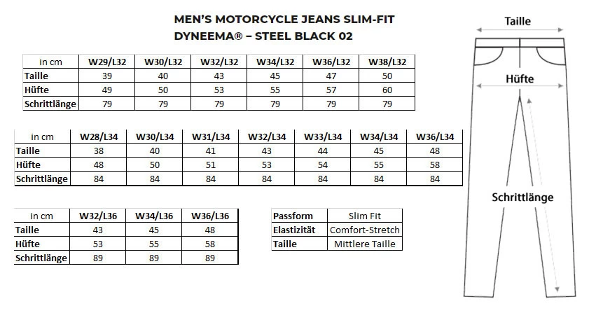 Wir von Bikeroutfit.de bieten die Steel Black 02 Jeans von Pando Moto an – eine schmal geschnittene, mittelhohe 13 oz einlagige Comfort Stretch Steel Black Jeans mit anthrazitschwarzer Farbe außen und innen. Sie ist CE-geprüft nach EN 17092 und halten im Rutschtest über 35 Meter. Diese Denim-Jeans wird durch 15-mal stärkeres Dyneema®-Gewebe als Stahl geschützt, das einen hohen Abriebschutz bietet. Anthrazitschwarze Farbe außen und innen bietet eine hohe Wärmeleitfähigkeit und reflektiert bis zu 80% des Lichts!