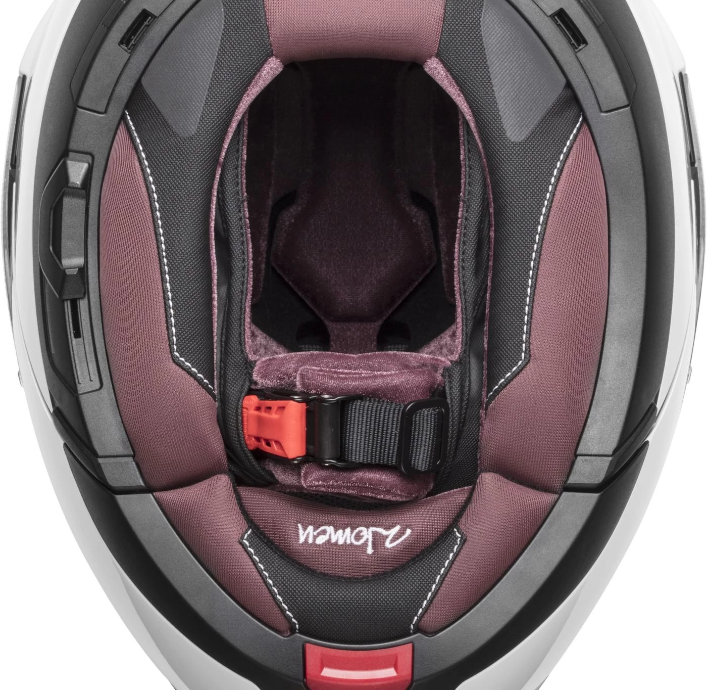 Der C4 PRO WOMEN überzeugt mit seiner neuen Innenausstattung mit nahtlosem Polster, optimierten Brillenkanälen und neuer Kinnriemenpolsterung, die maximalen Tragekomfort sichert. Dickerer Wangenpolster optimieren die Passform so, dass der C4 PRO WOMEN auch bei (sehr) schmalen Gesichtern sicher und komfortabel sitzt. Das Innenfutter ist speziell für Frauen entwickelt: Es ist nicht nur für kleinere Kopfformen optimiert, sondern berücksichtigt auch die weibliche Gesichtskontur. Sie wird von einer rubinroten Innenausstattung zusätzlich betont. Die Stoffe der herausnehmbaren Innenausstattung sind antibakteriell, waschbar und schnelltrocknend.