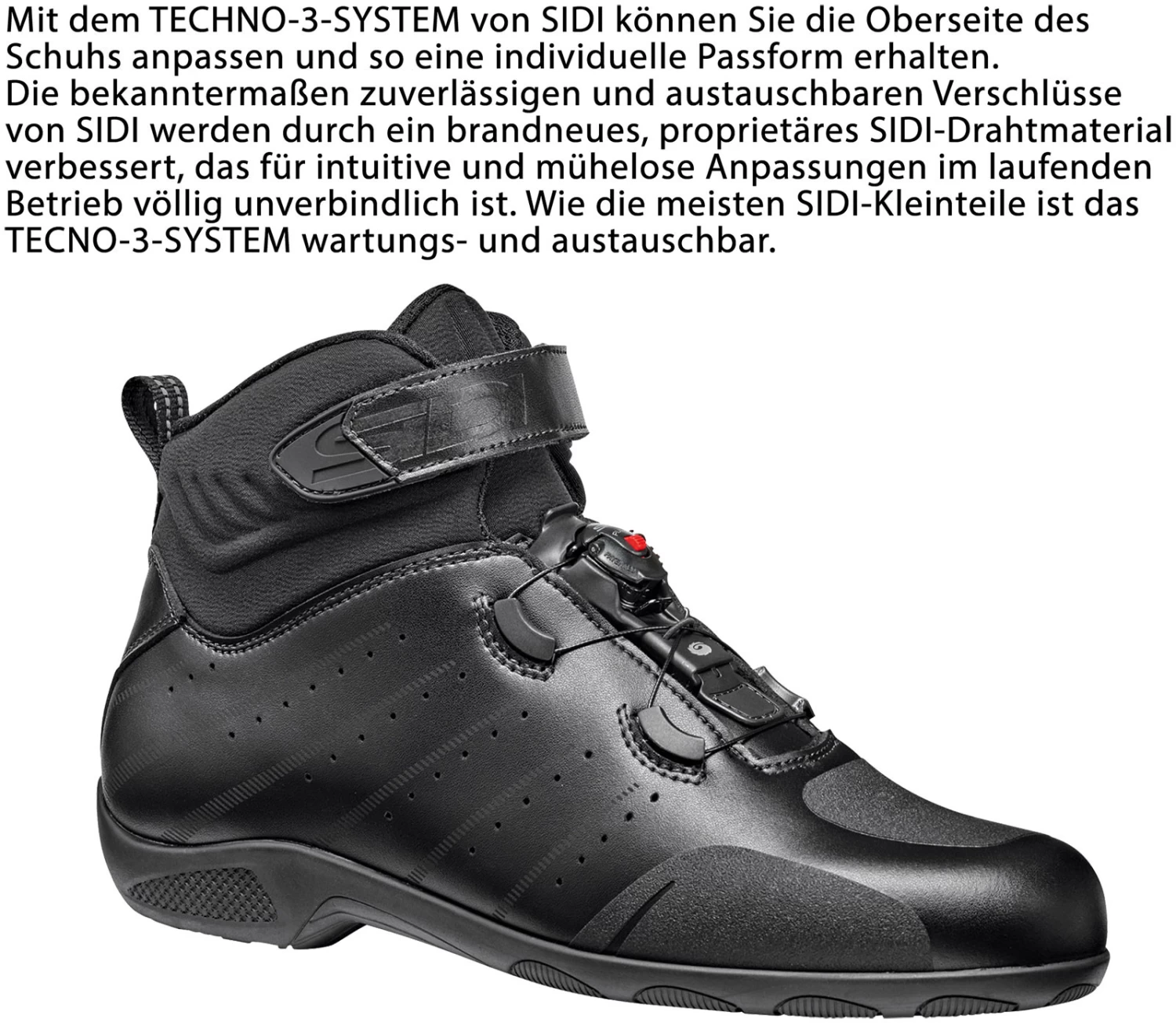 Mit dem TECHNO-3-SYSTEM von SIDI können Sie die Oberseite des Schuhs anpassen und so eine individuelle Passform erhalten. Die bekanntermaßen zuverlässigen und austauschbaren Verschlüsse von SIDI werden durch ein brandneues, proprietäres SIDI-Drahtmaterial verbessert, das für intuitive und mühelose Anpassungen im laufenden Betrieb völlig unverbindlich ist. Wie die meisten SIDI-Kleinteile ist das TECNO-3-SYSTEM wartungs- und austauschbar.