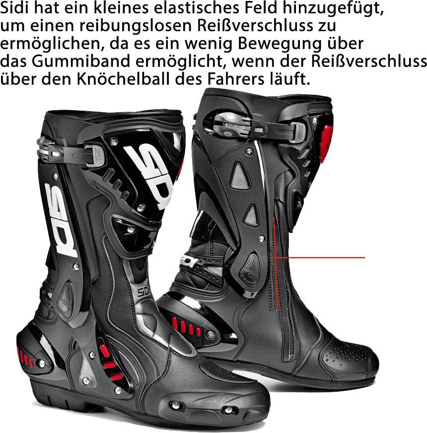 Sidi hat ein kleines elastisches Feld hinzugefügt, um einen reibungslosen Reißverschluss zu ermöglichen, da es ein wenig Bewegung über das Gummiband ermöglicht, wenn der Reißverschluss über den Knöchelball des Fahrers läuft.