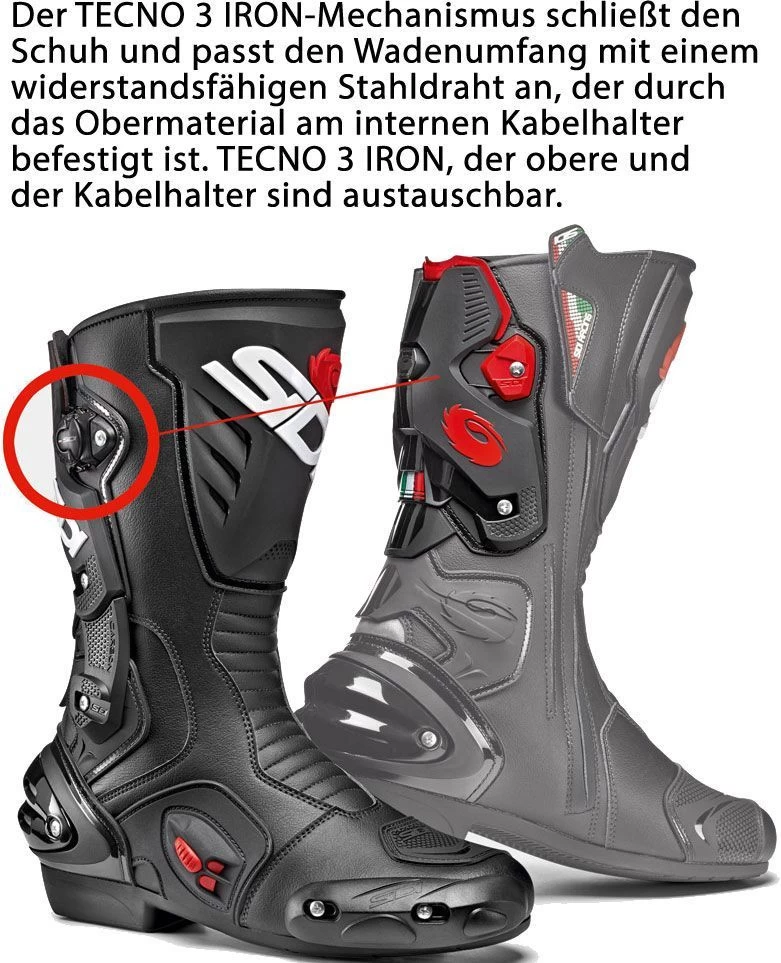 Der TECNO 3 IRON-Mechanismus schließt den Schuh und passt den Wadenumfang mit einem widerstandsfähigen Stahldraht an, der durch das Obermaterial am internen Kabelhalter befestigt ist. TECNO 3 IRON, der obere und der Kabelhalter sind austauschbar.