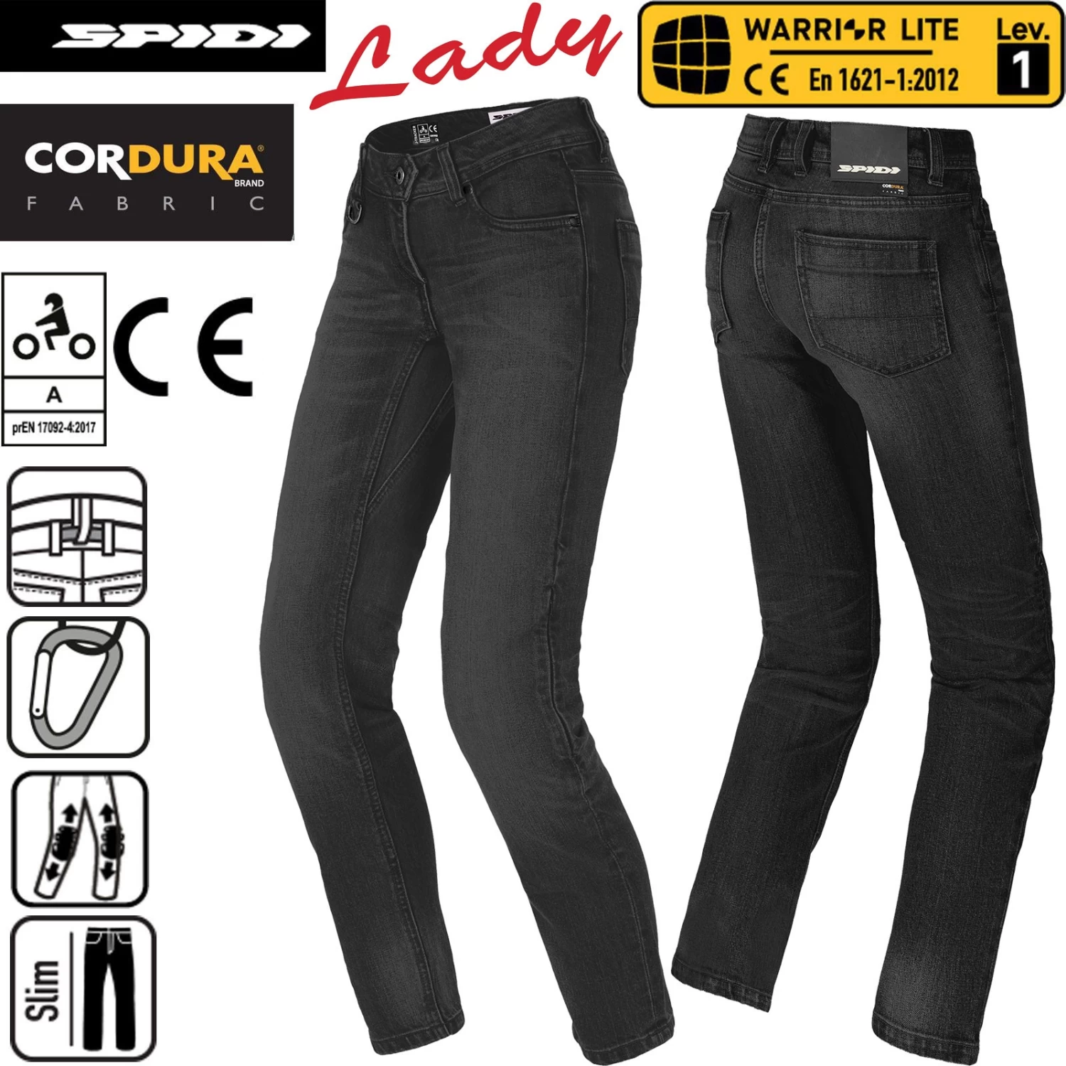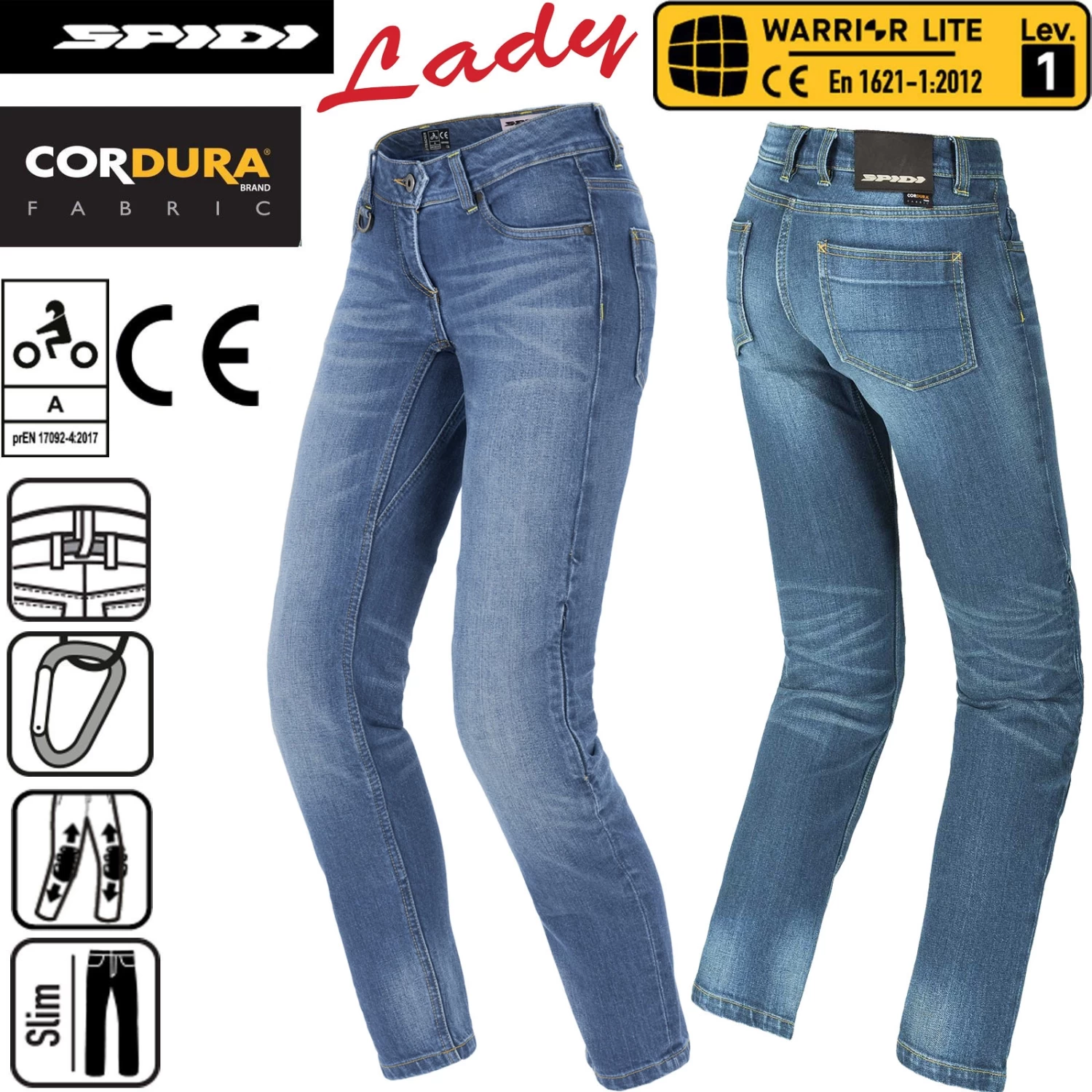 J-Tracker Lady ist eine Motorradjeans für Damen, gefertigt aus einem Cordura®/Denim Mischgewebe. Entwickelt in SPIDI´s Safety Lab, verbindet die J-Tracker Lady Zweckmäßigkeit mit Sicherheit; die nach EN 1621-1:2012 zertifizierten Warrior Lite Protektoren auf den Knien sind natürlich inklusive. Das diese Hose viel mehr ist als eine nur eine Jeans, zeigt sich in der Zertifizierung Schutzklasse A nach prEN 17092:2017.