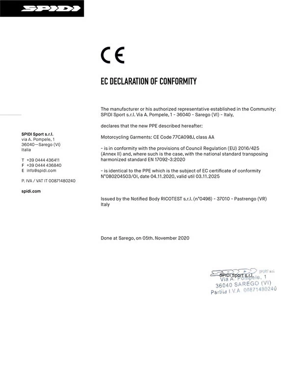 - CE: Motorradfahrer Schutzbekleidung entsprechend der Verordnung (UE)2016/454