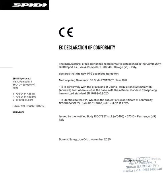 - CE: Motorradfahrer Schutzbekleidung entsprechend der Verordnung (UE)2016/454