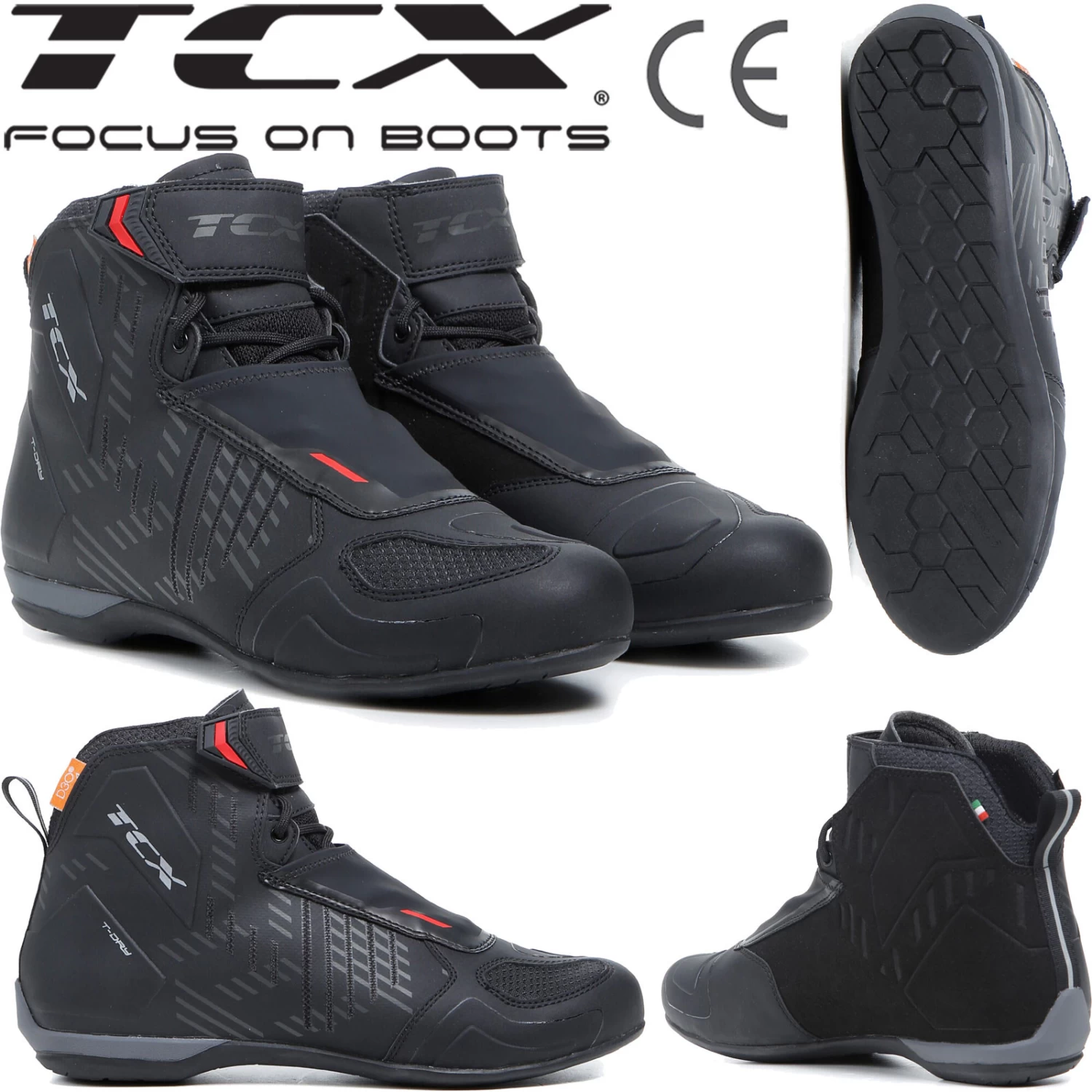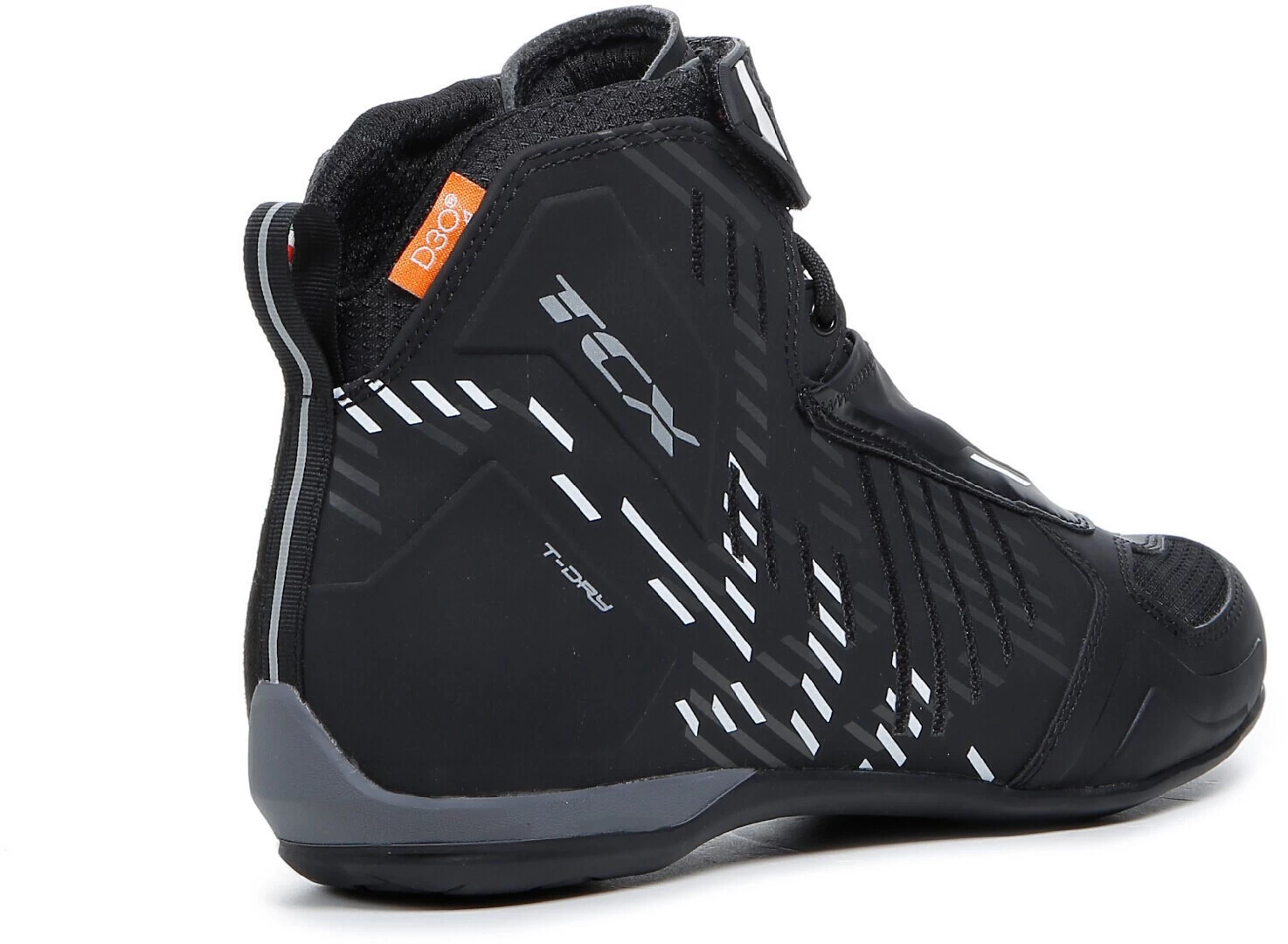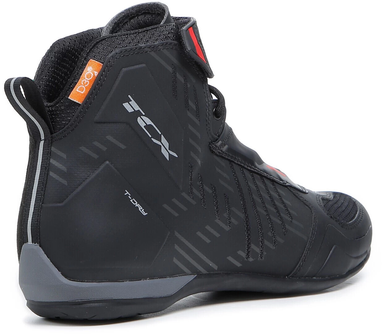 Der Schutz wird durch D3O®-Knöcheleinsätze und Verstärkungen im Zehen-, Fersen- und Ausrüstungsbereich gewährleistet. Der TCX RO4D WP-Schuh verfügt über eine OrthoLite®-Einlegesohle mit dauerhafter Dämpfung und hoher Atmungsaktivität sowie eine Groundtrax®-Sohle aus abriebfestem Gummi für maximalen Halt und Sensibilität. Aufgrund des hohen Tragekomforts können die Motorradschuhe problemlos den ganzen Tag getragen werden. Das Obermaterial besteht aus Mesh-Gewebe mit Hotmelt-Beschichtung.