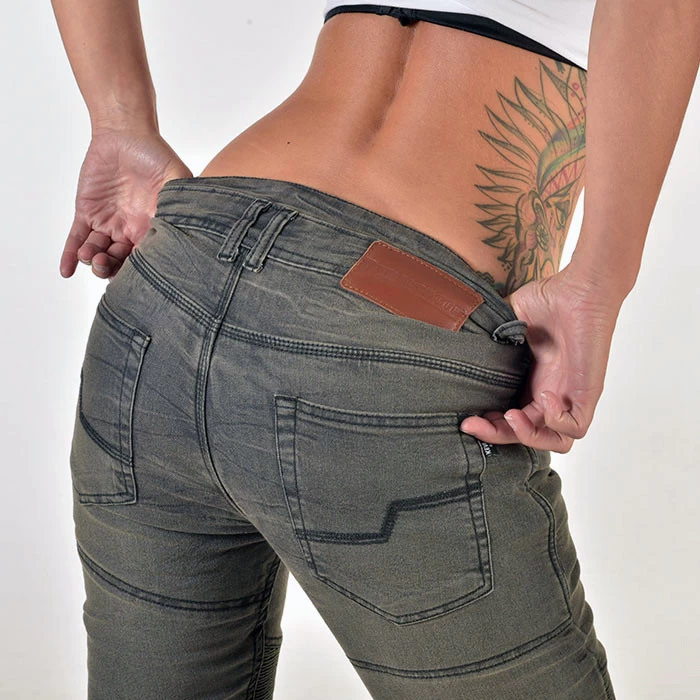 Für diejenigen, die es bevorzugen, gibt es Camouflage-Farboptionen in Non-Stretch-Denim. Der hohe Taillenrücken bedeckt den Rücken der Fahrerin perfekt, wenn sie unterwegs ist.