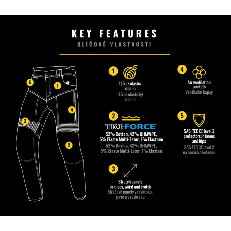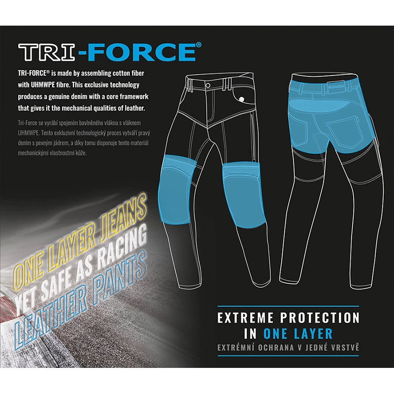 TRI-Force® Mechanical ist abrieb- und reißfest und bietet das ganze Jahr über hervorragenden Komfort. Die gute Nachricht ist, dass die Technologie in den Stoff integriert ist und nicht als Futter für Kleidung verwendet wird. Es ist das einzige Gewebe, das ein einlagiges Gewebe (auch Motorradnorm 13595-2) verwenden kann, um Abrieb zu verhindern und dennoch den Komfort und das Aussehen einer echten Jeans zu bieten. Tri-Force® ist ein Verbundmaterial, hat aber auch Flexibilität, Weichheit, Wasseraufnahme und Atmungsaktivität.