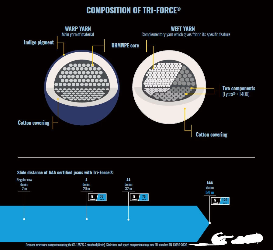Tri-Force® besteht aus Baumwollfasern in Kombination mit UHMWPE-Fasern (52 Mikron Wolle, 42% UHMWPE, 5% elastische Polyesterfasern, 1% elastische Fasern). Durch diese einzigartige Technologie entsteht ein echter Denim mit einer zentralen Struktur, die ihm eine gestrickte Optik verleiht.